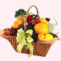 古铜色藤编果蓝盛放:红提、火龙果、水蜜桃、香梨、柑橘、苹果、菠萝、哈密瓜、红玫瑰8枝束扎,黄色丝带